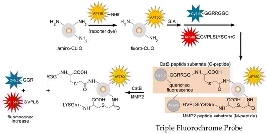 An imaging probe containing two types of fluorescently activatable peptide substrates and one type of reporter fluorochrome was synthesized according to Figure 1 and denoted as the Triple Fluorochrome Probe (TFP). “Triple” denotes that the imaging probe can monitor three fluorescence channels, while CLIO nanoparticles are used as a carrier scaffold. The primary amine of a dextran-coated CLIO (amino-CLIO) was first fluorescently labeled with a fluorochrome (reporter dye), creating “fluoro-CLIO” that monitors the delivery of the nanoparticle in vivo, and is then subsequently conjugated with fluorescently-labeled peptide substrates. The peptide substrates were conjugated to the nanoparticle using an activating agent, succinimidyl iodoacetate (SIA), which links the peptide substrates through the cysteine residue to the nanoparticle surface (Figure 1).