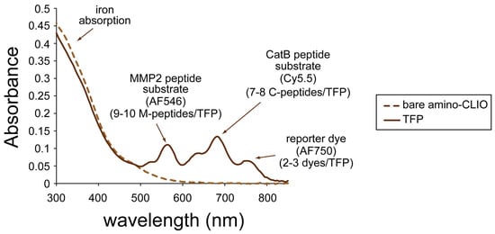 The absorption spectrum of the TFP imaging probe is shown in Figure 3 and has an absorption peak at 755 nm (corresponding to the reporter dye), 675 nm (corresponding to the Cy5.5 labeled C-peptide), and 555 nm (corresponding to the AF546 labeled M-peptide). The mass spectra of AF546 labeled M-peptide and Cy5.5 labeled C-peptide are shown in Figure S1 and Figure S2, respectively. The spectrum of the amino-CLIO is also shown in Figure 3. Iron oxide, represented as a dotted line, dominates the spectrum in the ultraviolet region, and whose little absorption is in/near the infrared region of the spectrum.