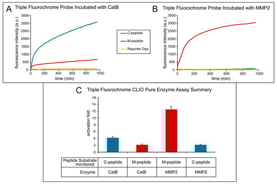 Figure 4 shows the effect of treating the TFP imaging probe with pure CatB and MMP2 enzymes. The activation of the fluorescence signal of the TFP imaging probe was tested under optimal conditions for CatB cleavage by using 20 mM of sodium acetate buffer (pH 5). Fluorescence activation was seen almost immediately with the addition of the CatB enzyme (Figure 4A, blue line) of the C-peptide substrate, while minimal fluorescence activation of the M-peptide substrate (Figure 4A, red line) occurred and essentially no fluorescence activation occurred in the reporter dye (Figure 4A, yellow line). The fluorescence activation of the TFP probe was also tested under optimal conditions for MMP2 cleavage by using 25 mM (4-(2-hydroxyethyl)-1-piperazineethanesulfonic acid) (HEPES) (pH 7). After adding the MMP2 enzyme, the fluorescence activation of the M-peptide substrate (Figure 4B, red line) was seen almost instantaneously compared to low to no fluorescence activation of the C-peptide substrate (Figure 4C, blue line) and the reporter dye (Figure 4B, yellow line). Figure 4C summarizes and compares the two experiments and illustrates the selective activation of the enzyme substrates by their respective enzymes with minimal activation of the other substrate.