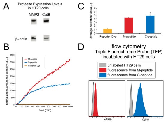 The imaging ability of the TFP probe was also evaluated in cell culture. Human HT29 cells were utilized, and a fluorescence microplate reader monitored the activation of the TFP imaging probe. Immunoblotting was done on this cell line to verify the presence of enzymes in this cell line (Figure 5A). Figure 5B shows the activation of both C-peptide and M-peptide substrates in cell culture due to the presence of both CatB and MMP2 enzymes in cell lines.