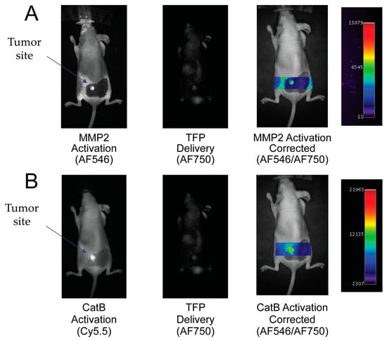 In vivo imaging of MMP2 and CatB activities with the Triple Fluorochrome Probe (TFP). (A) Imaging of MMP2 and the delivery reporter. (B) Imaging of CatB and the delivery reporter.