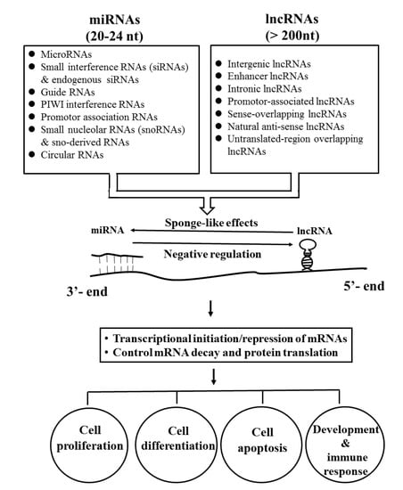 Different types of microRNAs (miRNAs) and long non-coding RNAs (lncRNAs) with their mutual interactions on the post-transcriptional regulation of mRNA expression and cell functions including proliferation, differentiation, apoptosis, and development of immune responses.