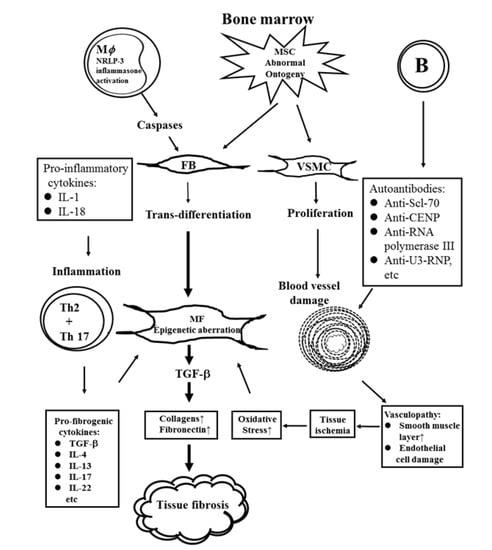 The underlying cellular and molecular bases of vasculopathy, chronic inflammation, and tissue fibrosis in patients with systemic sclerosis via pro-inflammatory cytokines, pro-fibrogenic cytokines, autoantibodies, caspases, and oxidative stresses to elicit trans-differentiation of fibroblasts to myofibroblasts and finally tissue fibrosis in the patients. Mφ: macrophage, MSC: bone marrow-derived mesenchymal stem cell, FB: fibroblast, MFB: myofibroblast, VSMC: vascular smooth muscle cell.
