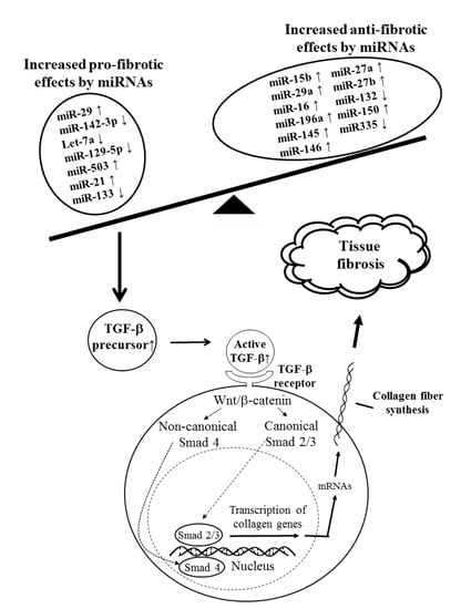 It is conceivable that approximately 50% miRs are expressed from non-protein coding transcripts. The rest are located in the introns of the coding genes and are co-transcribed with their host genes, but are separately processed for intracellular modulation of gene expression. Besides, miRs are also contained in the extracellular small vesicles such as exosomes. Exosomes are micro-vesicles encapsulated by lipid bilayer, containing insides various biomolecules such as proteins, lipoproteins, carbohydrates, DNAs, mRNAs and miRs, to act as vehicles for inter-cellular or inter-tissue communications. Previous investigators have demonstrated that many miRs are involved in the fibrinogenesis in SSc. These fibrosis-related miRs can be classified into pro-fibrotic and anti-fibrotic miRs detected in the dermal FBs [137,138] or circulating exosomes [139,140] in patients with SSc. Once the imbalance between pro-fibrotic and anti-fibrotic miRs in Th2 cells of SSc patients occurs toward profibrotic end, some mechanisms would trigger TGF precursors toward active form of TGF-β in Th2 cells. The released active form of TGF-β then binds to TGF-β receptors on MFBs, initiating a transcription and synthesis of collagen fibers through Wnt/β-catenin signaling pathways [49,141,142,143,144,145] as mentioned in the above (Section 3.2). Figure 4 illustrates the imbalance between pro- and anti-fibrotic miRs with a skewing toward fibrinogenesis, which transduces fibrosis signaling in patients with SSc.