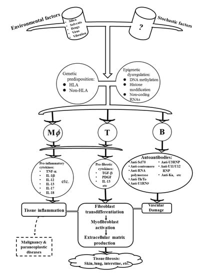Putting all of the SSc-related pathogenic factors together, a scheme depicting the potential contributing factors for tissue fibrosis and paraneoplastic syndrome is shown in Figure 5.