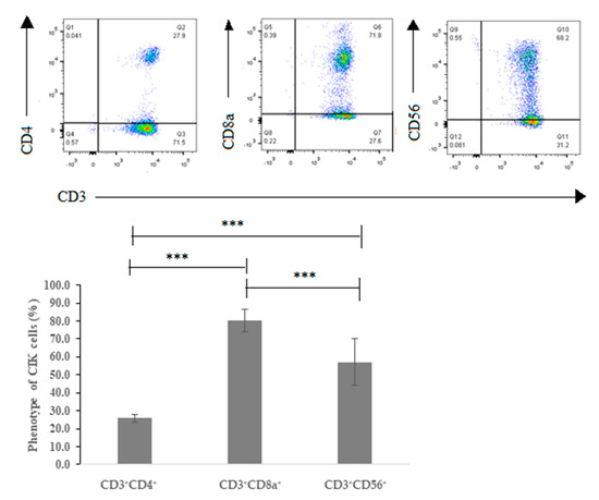 Main phenotype of cytokine-induced killer (CIK) cells derived from donors (n = 3) on day 14. Differential expression of three main phenotypic subsets of CIK cells, CD3/CD4/CD8. *** represents a p value < 0.001.