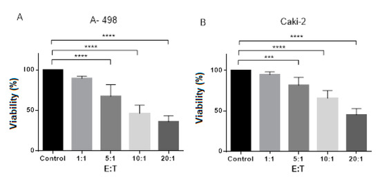 Effects of different CIK cells numbers on the viability of renal cells (effector:target (E:T) ratio) after 72 h of coculture. n = 3 healthy donors. (A) Coculture of CIK cells and A-498 in different ratios. (B) Coculture of CIK cells and Caki-2 in different ratios. Absorbance values have been normalized into percentages with each untreated control showing 100% viability as a reference. *** represents a p value < 0.001, **** represents comparing to untreated tumor cells control, a p value < 0.0001. E:T ratio represents a ratio of effector cells (CIK cells) and target cells (tumor cells).