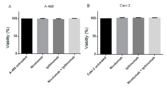 The purpose of this assay was to assess potential effects of nivolumab and ipilimumab on the viability of the A-498 and Caki-2 cells. Renal carcinoma cell lines were treated with 20 μg/mL nivolumab, 20 μg/mL ipilimumab and a combination of both drugs with the same concentration for 72 h and compared to untreated cell lines.