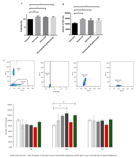 Figure 5 presents the proliferation of the CIK cells with nivolumab and ipilimumab after 3 days of incubation. Figure 5A shows the percentages of the viable CIK cells after antibody treatment using a CCK-8 cell proliferation assay. We found that the proliferation of CIK cells significantly increased after all treatments compared to untreated CIK cells (p = 0.0087). Figure 5B,C displays the counts of viable CIK cells after treatments, using the trypan-blue manual counting method and automatic Precision Count Beads™ counting. The initial number of CIK cells was 5 × 104. There were statistically significant increases in the number of CIK cells after a combination treatment with nivolumab and ipilimumab compared to the untreated control (p = 0.0227 and p = 0.042, respectively).