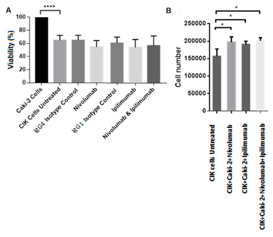 In summary, a combination treatment of nivolumab plus ipilimumab showed no significant decrease of the viability of A-498 and Caki-2 cells. Conversely, there was a statistically significant increase in the number of CIK cells with the combination treatment compared to untreated CIK cells.