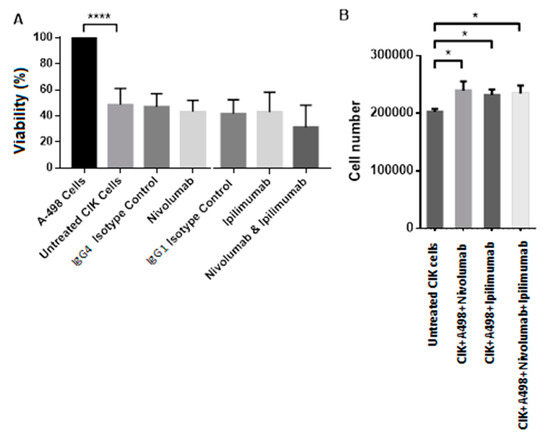 Figure 7A,B show the percentages of viable cells compared to the untreated CIK cells after treatment with nivolumab and ipilimumab in a coculture of CIK cells with the A-498 cell line system. After coculture with CIK cells, the viability of A-498 cells decreased to 50% (p < 0.0001). Figure 7A shows the percentage of cell viability reduction to approximately 30% after treatment with nivolumab plus ipilimumab, but there was no statistically difference compared to untreated CIK cells (p = 0.4425). Figure 7B displays the number of viable CIK cells significantly increased when they were cocultured with A-498 with a combination treatment of nivolumab and ipilimumab by trypan-blue staining, comparing to untreated CIK cells (p = 0.0210).