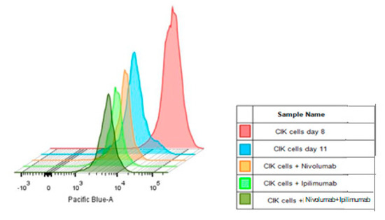Figure 8 presents the proliferation ability of CIK cells after immune checkpoint inhibitors treatments. The histogram shows a significant reduction in intensity of CellTrace™ dye after 3 days CIK cells culture (p < 0.0001). The mean intensity decreased more rapidly than in untreated CIK cells after treatment with nivolumab and ipilimumab (Table 1).