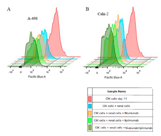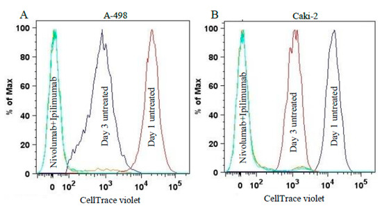 Proliferation of renal cells labeled with CellTrace violet after 72 h of a monoculture and coculture with CIK cells treated with nivolumab and ipilimumab. (A) Histogram of the A-498 mono- and coculture with CIK cells. (B) Histogram of the Caki-2 mono- and coculture with CIK cells.