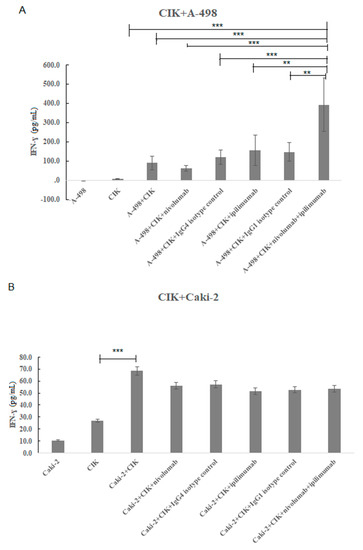 Figure 11B shows the data for CIK cells in a coculture Caki-2 system after 48 h with the PD-1 blockade/CTLA-4 blockade treatment or a combination treatment. In contrast to untreated CIK cells, the IFN-γ secretion increased significantly in the presence of Caki-2 cells (68.5 ± 49.0 pg/mL versus 26.9 ± 15.7 pg/mL, p = 0.003). However, there was no significant difference on the concentration of IFN-γ after treatment of nivolumab and ipilimumab compared to that of nivolumab or ipilimumab monotreatment. Hence, the IFN-γ secretion by CIK cells increased markedly after treatment with nivolumab and ipilimumab coculture with A-498 cells compared to the monotreatment of nivolumab or ipilimumab.