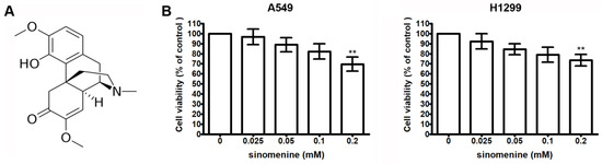 The chemical structure of sinomenine is shown in Figure 1A. The cytotoxic effect of sinomenine on human lung cancer A549 and H1299 cells is demonstrated in Figure 1B,C. The results reveal that treatment with 0.2 mM of sinomenine for 24 h significantly decreases the viability of A549 and H1299 cells, while treatment at doses below 0.1 mM does not cause cytotoxicity.