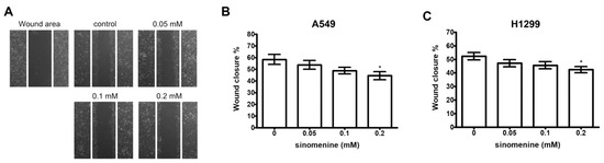 Effect of sinomenine on migration of A549 and H1299 cells. (A) A549 cell monolayers were scraped by a sterile micropipette tip and the cells were treated with various doses of sinomenine for 24 h. Cells that migrated to the wounded region were photographed (100× magnification). The wound area of the cultures of A549 cells (B) and H1299 cells (C) were quantified in four fields in each treatment, and data were calculated from three independent experiments. Data are presented as mean ± S.D. of three independent experiments. * p < 0.05 compared with the untreated control.