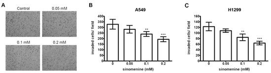 In the view of cytotoxicity at a higher concentration of sinomenine, the inhibitory effect of non-toxic doses of sinomenine on the migration and invasion of A549 cells was investigated. After incubation with various concentrations of sinomenine for 24 h, 0.2 mM of sinomenine significantly suppresses the migration of A549 cells (Figure 2A,B). The inhibitory effect of sinomenine on the migration of H1299 cells was also observed (Figure 2C,D). These results demonstrate that sinomenine significantly inhibits the migration of A549 and H1299 cells.