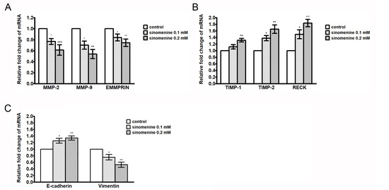 In order to investigate the mechanism of sinomenine on suppressing migration and invasion, A549 cells were used for the following experiments. During cell invasion, a proteolytic degradation of the ECM is required. Therefore, the effect of sinomenine on the expression of genes involved in the ECM degradation was analyzed by quantitative real-time PCR. The primer sequences are listed in Table 1. Data show that sinomenine decreases the mRNA expression of MMP-2, -9, and EMMPRIN/CD147 (Figure 4A). In addition, sinomenine enhances the expression of TIMP-1, -2, and RECK, which negatively regulate the activity of MMPs (Figure 4B). These results suggest that expressions of these genes involved in the degradation of the ECM are affected by sinomenine. Moreover, sinomenine significantly increases the expression of E-cadherin but decreases the expression of vimentin on the mRNA level in A549 cells (Figure 4C), suggesting sinomenine may induce the reversal of EMT.