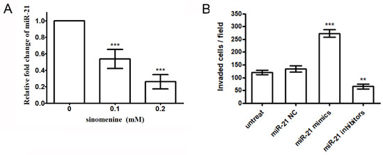 Previous reports demonstrated that miR-21 is overexpressed in lung cancer cells in which miR-21 targets RECK and subsequently enhances cell invasion [20,24]. Quantitative real-time PCR was performed to detect the effect of sinomenine on the expression of miR-21. The result shows that sinomenine downregulates the expression of miR21 in a dose-dependent manner (Figure 5A). The decrease in the miR-21 expression by sinomenine may be involved in the anti-invasive mechanisms of sinomenine. To further investigate the role of miR-21 in the invasion of A549 cells, miR-21 mimics or inhibitors were transfected into A549 cells. The results demonstrate that cell invasion is elevated by the miR-21 mimics but reduced by the miR-21 inhibitors (Figure 5B). These findings indicate that the inhibition of the miR-21 expression may suppress cell invasion.