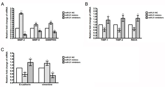 Effect of miR-21 on the expressions of MMP-2/-9, EMMPRIN/CD147, TIMP-1/-2, RECK, E-cadherin, and vimentin in A549 cells. A549 cells were transfected with the miR-21 negative control, miR-21 mimics, or mir-21 inhibitors for 48 hrs. Cells were harvested and the expressions of MMP-2, MMP-9, and EMMPRIN/CD147 mRNA (A), TIMP-1, TIMP-2, and RECK (B), and E-cadherin and vimentin (C) were analyzed by quantitative real-time PCR. Data are expressed as mean ± S.D. of three independent experiments. * p < 0.05, ** p < 0.01, *** p < 0.001 compared with the untreated control.