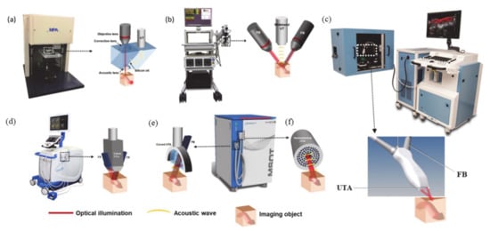 Commercially available photoacoustic imaging (PAI) systems along with the schematic depiction of imaging procedures: (a) Optical resolution photoacoustic microscopy, (b) Raster-scanning optoacoustic mesoscopy (RSOM), and (c,d) photoacoustic tomographic imaging devices equipped with linear (e) curved and (f) spherical transducer designs. (FB: fiber bundle; UTA: ultrasound transducer array). Adapted from Reference [] under creative commons license.