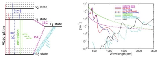 The efficiency of PA signal generation depends on different factors: a) a fast non-radiative deactivation (internal conversion); b) a higher order excitation (S2 and above) and relaxation; and c) a minimal fluorescence quantum yield are necessary for an efficient contrast agent. Especially the latter property has an inversely proportional effect on the PA signal, as the amount of absorbed energy released by fluorescence is a loss for heat generation (Figure 2, left). Endogenous pigments, such as oxy/dexoy-hemoglobin, melanin, and other materials, such as lipids and collagen, were explored in PA contrast generation, as they exhibit absorption at various wavelengths (Figure 2, right). On the other hand, exogenous PA probes are interesting due to their improved signal to background ratio, targetability, and characteristic spectral signatures. For in vivo imaging, the near-infrared (NIR-I device range: 680–970 nm, NIR-II: 1064 nm) absorbing materials are preferred, as NIR-light undergoes less scattering and absorption in tissue. Therefore, developments of such dyes are particularly in the focus of research [,,,].