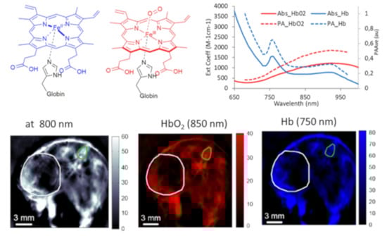 An often used endogenous compound in PA applications is the tetrapyrrole-based Fe(II)/Fe(III)protoporphyrin (PpIX) in hemoglobin (Figure 3, top left). The Fe(II)/Fe(III) PpIX exhibits distinct differences in absorbance for oxygen-unbound and -bound forms (Hb, HbO2; 750 nm vs. 850 nm, isosbestic point at 798 nm) (Figure 3, top right) and shows detectable PA signals in the red to NIR range. The whole blood PA measurement first gives an overlaid spectrum of both, HbO2 and Hb, with respective intensities. By using a mathematical model, the device’s integrated software takes the pre-calibrated 100% HbO2 and Hb values, and separates the observed spectrum into respective HbO2 and Hb agents. The respective PA signal intensities can be used for the determination of the total hemin concentration, for the determination of the partial oxygen (saturation), and for the identification of hypoxic regions and the heterogeneity in the vascularity of organs and tumors (Figure 3, bottom) []. Commercially available PA devices are already equipped with the pre-loaded library of PA spectra of 100% oxygenated (HbO2) and deoxygenated (Hb) blood, along with the other commonly used endogenous or exogenous pigments, simplifying their application for non-experienced users.