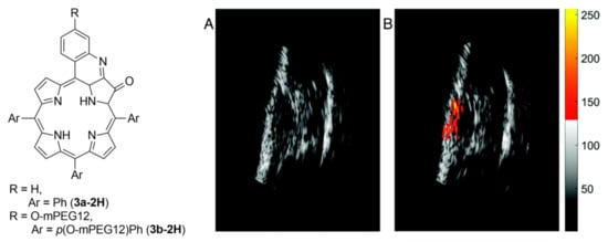 Left: Structure of NIR-absorbing β-,meso-quinoline-annulated porphyrin; right: photoacoustic images with PEGylated derivatives (3b-2H) (A) before and (B) after 10-min injection of 3.33 µmol/mL 3b-2H in a mice inoculated with tumor (the red zone contained PA probe, and Z-axis scales are arbitrary units). Reproduced from Reference [] with permission from the Royal Society of Chemistry.