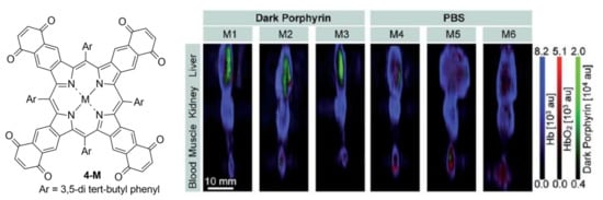 Left: Structure of the quinone-fused “black” porphyrin (4-M); right: evaluation of a NIR-absorbing (M = Zn) derivative as contrast agent for in vivo photoacoustic imaging in healthy mice (multispectral optoacoustic tomography (MSOT) spectral unmixing of the 4-Zn signals from the blood; no 4-Zn remained in blood after 1 h). Reproduced from Reference [] with permission from the Royal Society of Chemistry.