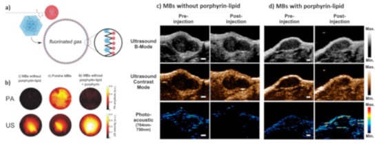 Left: (a) Conceptual representation of self-assembled chlorin-phospholipid microbubbles with heavy gaseous cores; (b) the phantom PA signals of the microbubbles with and without chlorin, along with US images; Right: in vivo tumor accumulation US/PA imaging of (c) MBs without chlorin, and (d) MBs with porphyrin before and after the infusion. Adapted with permission from References [,]. Copyright: (2012; 2014) American Chemical Society.