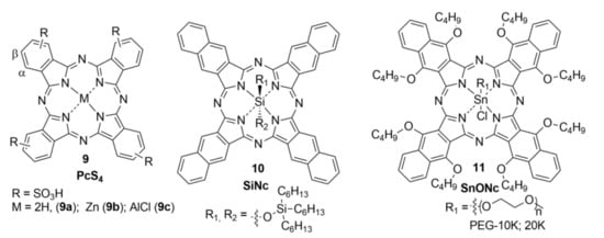Chemical structures of phthalocyanines (PcS4, 9) and naphthalocyanines, SiNc (10) and SnONc (11)).