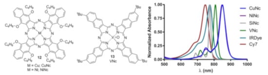 Chemical structure of naphthalocyanines (12, 13) and their absorption spectral overlay along with other NIR-dyes (right). Reprinted with permission from Reference []. Copyright (2018): Elsevier.