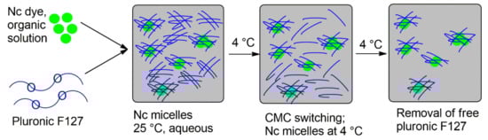 Although excellent PA signals were obtained from existing Pcs and Ncs, their insolubility in water hinders their biomedical use. Several formulations were investigated to overcome this obstacle. Prud’homme and coworkers explored flash nanoformulations (FNP) using block copolymer directed self-assembly and surface coatings with polyethylene glycol (PEG) []. Upon the incorporation of the (N)Pc dyes, they obtained water-dispersible nanoparticles with sizes from 38 to 88 nm, whose absorption were in the NIR range. Furthermore, they showed that the PEG-arm on the surface could be used for functionalization, e.g., for folate receptor targeting. Lovell and coworkers used a different approach for loading Pcs and Ncs into micelles. For this pluronic, F-127 was used, which shows a concentration-sensitive critical micellar temperature and can reversibly be switched to incorporate hydrophobic (N)Pcs in nanoparticulate to microcrystalline form. The Lovell group utilized this property to obtain a minimal surfactant-contained colloidal suspension. For this purpose, a standard F-127 micellar formulation was prepared first, which when cooled to 4 °C, and maximal amount surfactant was stripped off, forcing the dye molecules to form nano aggregates with minimal surfactant (Figure 10) [,]. Then, the free and loose surfactant were removed by centrifugal membrane filtration at 4 °C, producing Nc colloidal suspension, which was called “frozen micelles” by the authors. Interestingly, the process did not alter dyes’ absorptions and showed suitability for NIR-II range PAI (1064 nm). Furthermore, the frozen micelles were found to be highly stable at the low pH values present in the stomach. The micelles passed safely through the intestine without any adsorption upon oral insertion and thus allowed imaging of the dynamics of the gut passage by PAI in real-time [].