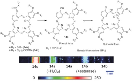 Uchiyama and coworkers approached the ROS detection with a novel design inspired by Pc, namely benziphthalocyanine (BPc, 14c), incorporating a phenol in the Pc macrocycle (Figure 11) []. The BPc exhibited a quinoid-phenolic equilibrium and a high photostability, as Pcs, but weak NIR absorption 870 nm (ε = 1.64 × 103 M−1cm−1) and no fluorescence emission. The equilibrium of 14c could be blocked by methoxylation, which shifted λmax from 870 to 584 nm (ε = 5.31 × 103 M−1cm−1). This proved that the presence of a free hydroxyl group was essential for tautomerism in BPcs. The Uchiyama group used this principle and decorated the BPc with thiocarbonate (14a) and acetoxybutanoylate (14b) as esterase or H2O2 cleavable groups, respectively, to generate trigger-responsive probes for PAI. Although these reactive BPcs did not give a large gain (<5×) in PA signal, their activation could be detected by a large redshift in PA maximum (>300 nm, into NIR). This unique feature change in conjugation in response to in vivo triggers could be further explored in NPc-based designs for NIR-II imaging.