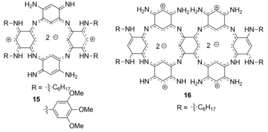 There is a high demand for PAI probes exhibiting absorption in the second biological transparency window (NIR-II: 1000 to 1400 nm) as indicated in earlier sections. Current probe research has, so far, not utilized the porphyrin or phthalocyanines (except PPc) for PAI in the NIR-II range. There was a limitation in the porphyrin or Pcs to achieve the NIR-II absorption due to constraint in the core electronic configuration. Thus, to overcome this limitation, recently, tetrapyrrole-inspired tetraaza tetrabenziporphyrin (azacalixphyrins) was designed, which contained 18-π electrons in the macrocycle system []. This design completely avoided the pyrrole and used tetraiminobenzene in macrocyclization, thus displaying a bis-zwitterionic character: anionic core and cationic periphery (15, Figure 12). The azacalixphyrins exhibited a NIR-absorption band (λmax > 880 nm, ε > 10,000 M−1cm−1), which can be redshifted by substituting imines with electron-rich aryl groups up to λmax of 941 nm with ε > 20,000 M−1cm−1. It was found that the PA spectra directly correlate with the absorption spectra, and a linear dependency of concentration to signal strength was observed []. Similarly, a dimeric fused bis-azacalixphyrin (16), sharing an aromatic unit, was reported recently, which exhibited a strong absorption band in the NIR-II window (λmax = 1029 nm, ε = 17,800 M−1cm−1) []. This bis-fused 16 could be further fine-tuned, and PA applications are yet to be reported.