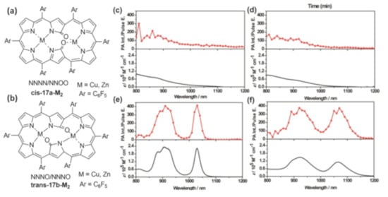 Structures of (a) cisoid- (b) transoid-metallodioxohexaphyrin metal complexes; (c-f) PA (top, red) and absorption (bottom, black) spectra (in dimethyl formamide) of (c) cis-17a-Zn2, (d) cis-17a-Cu2, (e) trans-17b-Zn2 and (f) trans-17b-Cu2 (adapted with permission from Reference []. Copyright: (2020) American Chemical Society.
