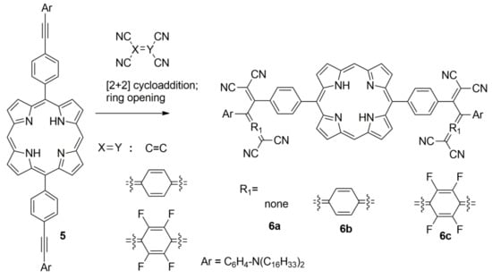 It is known that the conjugation of strongly electron-withdrawing tetracyanoethene (TCNE) or tetracyanoquinodimethane (TCNQ) groups with electron rich anilines via a π-system leads to NIR-absorption []. Wanli et al. exchanged the π-system with a porphyrin, that contained a 4-(p-alkynyl-anilinyl) phenyl at meso position (5) to tune the absorption []. In this work, the authors systematically changed acceptor electron-withdrawing efficiency of tetracyanodimethanes with the porphyrin donor-π system (6a-c, Scheme 2). This insertion reaction first underwent a (2 + 2) cycloaddition with the alkyne followed by a ring opening sequence yielding a series of dyads with embedding porphyrin, which exhibited strong NIR absorption. Subsequently, photophysical and PA measurements of these porphyrins were carried out, and it was found that the double incorporation of highly electron withdrawing tetrafluoro-tetracyanoquinodimethane (F4-TCNQ) lead to an intense NIR band (λ = 866 nm; ε = 5.6 × 104 M−1cm−1) and stronger PA signal than the other dyads. Although this porphyrin incorporation in donor-acceptor dyad redshifted the charge-transfer absorption band, the relative increase in size, and hydrophobicity demand redesign of such acceptor incorporation systems for biomedical applications.
