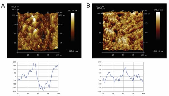 Atomic-force microscopy (AFM) images of representative specimen surfaces (100 × 100 µm2, upper panel), and corresponding scan profiles (lower panel) of the tested blocks. (A) titanium and (B) ceramic. Bright areas indicate high points, and dark areas indicate low points across the surface. (Lower graph: X- and Y-axes measured in micrometers).