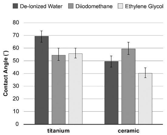 Surface energy, calculated from the contact angles (Figure 2) based on the Good–van Oss theory (vOGT), was assessed by total surface free energy and values of surface free energy components (mJ/m2) of all specimen groups. The results exhibited relatively similar surface free energies between the tested material surfaces, without any statistical difference (Table 1).