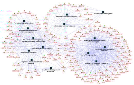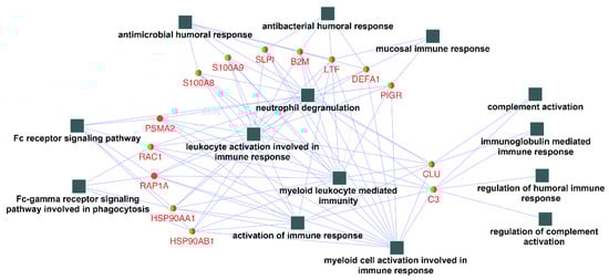 In order to identify and characterize representative genes that function as key connections between functional terms, the connectivity degree distribution (connectivity between nodes) of the constructed protein–protein interaction network (Figure 3) were examined, and proteins with six or more direct interacting partners were selected as essential proteins in the network, based on the previously proposed methods [,,]. Fourteen hub proteins were identified (coding gene: B2M, C3, CLU, DEFA1, HSP90AA1, HSP90AB1, LTF, PIGR, PSMA2, RAC1, RAP1A, S100A8, S100A9, and SLPI), which represented 30.5% of the total protein connectivity. The constructed sub-network revealed the possible relations of these proteins and related immunological processes (Figure 4).