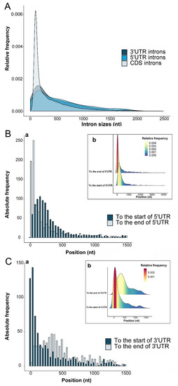 Length distributions of 5′UTR, 3′UTR and CDS introns (A) and position distribution of 5′UTR introns (B) and 3′UTR introns (C) relative to the beginning and end of the associated UTRs. For Figure 2A, the horizontal axis represents the size of the intron, and the vertical axis represents the proportion of the introns of different sizes. For Figure 2B,C, (a) Blue bars represent the observed positions of 5′UTR introns relative to the beginning of the 5′UTR and 3′UTR introns relative to the beginning of the 3′UTR (terminate the codon proximal end). Light blue bars represent the observed positions of 5UIs relative to the end of the 5′UTR (i.e., the start codon ATG) and 3UIs relative to the end of the 3′UTR. (b) Sierra of UIs relative to the end of the UTR and the end of the UTR with color diversity.