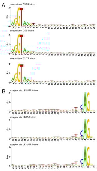 Sequence logos showing the nucleotide bias around the donor site (A) and acceptor site (B) of 5′UTR, CDS, and 3′UTR introns. The sequence marker shows the nucleotide deviation around the donor site and acceptor site of the 5′UTR, CDS, and 3′UTR introns. The x-axis refers to the base at the beginning of the intron, and the letter height reflects the nucleotide deviation at each position. Only 5 nucleotide exons and 25 nucleotide intron sequences of the donor site and only 2 nucleotide exons and 25 nucleotide intron sequences of the acceptor site are included in the sequence identifier, because the nucleotide usage outside of these regions is not significantly different from the background level.
