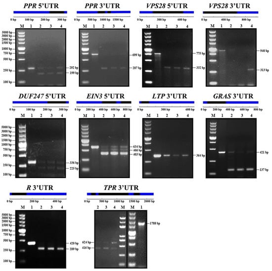 Electrophoresis detection results of the UTR introns (UIs) in untranslated regions (UTRs) of the eight selected genes. 1~4 respectively represents the PCR products using leaf gemomic DNA (gDNA), root complementary DNA (cDNA), leaf cDNA, and stem cDNA as template, respectively. M: DL5000 Marker; The UTR structure is available on the GSDS online website (http://gsds.cbi.pku.edu.cn/), with blue for exons and black for introns in UTR. PPR: Pentatricopeptide repeat superfamily protein (Cs6g01290.1), VPS28: Vacuolar protein sorting-associated 28 (Cs2g06750.1), EIN3: Ethylene-insensitive 3 (Cs2g29100.1), DUF247: domain of unknown function 247 gene (Cs2g24990.1), GRAS: GRAS transcription factors (Cs8g18700.1), TPR: Tetratricopeptide repeat-like superfamily protein (Cs8g15200.1), R: Disease resistance protein (Cs5g21990.1) and LTP: Lipid transfer protein (Cs5g09070.2).
