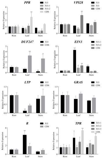 Relative expression results of genes and their UTR introns (UIs) in Citrus sinensis root, leaf and stem. * and ** respectively represent significant difference (p < 0.05) and very significant difference (p < 0.01) compared with root. 5UI: intron in the 5′UTR; 3UI: intron in the 3′UTR; CDS: coding sequence; represent the relative expression levels of genes containing these structures. PPR: Pentatricopeptide repeat superfamily protein (Cs6g01290.1), VPS28: Vacuolar protein sorting-associated 28 (Cs2g06750.1), EIN3: Ethylene-insensitive 3 (Cs2g29100.1), DUF247: domain of unknown function 247 gene (Cs2g24990.1), GRAS: GRAS transcription factors (Cs8g18700.1), TPR: Tetratricopeptide repeat-like superfamily protein (Cs8g15200.1), R: Disease resistance protein (Cs5g21990.1) and LTP: Lipid transfer protein (Cs5g09070.2).