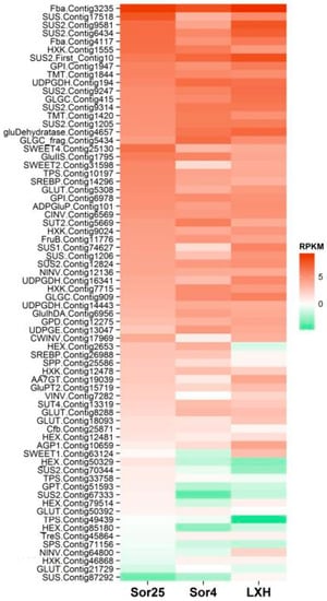Heatmap of differential gene expression of carbohydrates. In this figure, Sor25 means that the apical meristem of Oriental lily ‘Sorbonne’ is in the period of not vernalized yet, Sor4 means oriental lily ‘Sorbonne’ vernalization completion period in the apical meristem, and LXH means the Oriental lily ‘Sorbonne’ flower bud differentiation period. The expression level represented in the heat map was log2-based. The color scale represents transcript abundance in which green to red represents a change in the expression level from low to high.