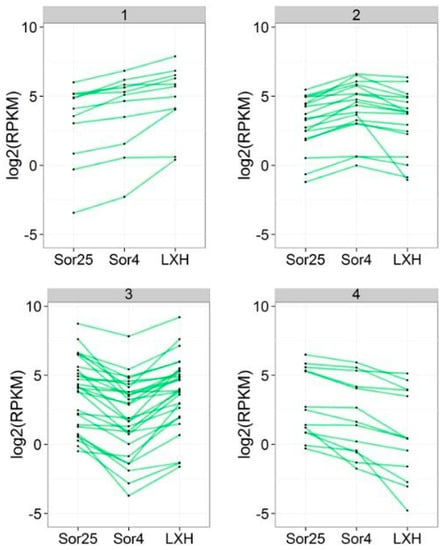 In order to further understand the expression regularity of carbohydrate metabolism genes in periods of Sor25, Sor4 and LXH of oriental lily ‘Sorbonne’, this study clustered the above genes according to the RPKM changes in the three periods. Results showed that they were divided into four kinds of expression patterns including continuous up-regulation (Cluster 1), first rise and then fall (Cluster 2), first drop and then rise (Cluster 3), and continued to decline (Cluster 4).