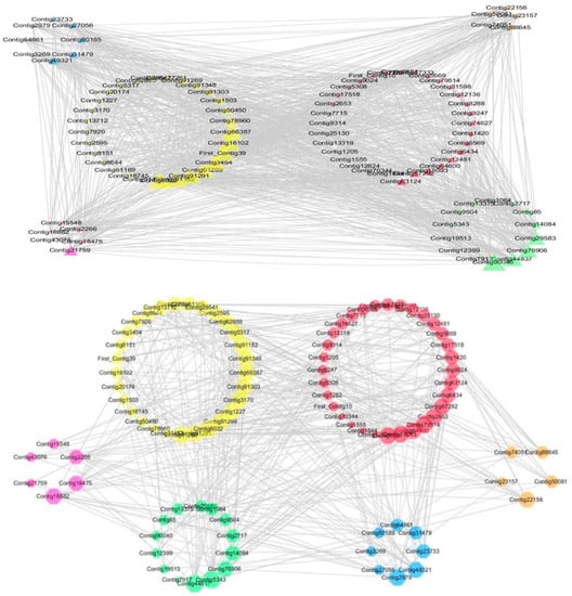Gene co-expression network (GCN) is a kind of molecular biological method where microarrays or deep-sequencing (RNA-seq) were used to judge the interactions of genes. Genes are usually represented as nodes, and edges represent pairwise relationships between genes. In order to explore the correlation between carbohydrate metabolism genes and genes related to flower differentiation, Auxin, Gibberellin, cold and methylation, this study collected reliable sequences of the above genes with significant differences of expression in the transcriptome data [] to establish Carbohydrate Metabolism Gene Co-expression Patterns. When setting p = 0.95 (Pearson’s correlation coefficient) for the standard selection of the correlation coefficient, the carbohydrate metabolism genes were closely related to all other genes. It was further stated that carbohydrates were not only energy-supplying substances, but played a pivotal role in the regulation of gene expressions. The carbohydrate metabolism genes were extremely close to flower differentiation, auxin and methylation genes, and these kinds of genes may co-ordinate the impact of the process in lily apical meristem. However, it is difficult to distinguish the importance among them because almost all kinds of genes were related. The correlation coefficient of the standard selection was then improved to 0.99. The number of genes and associated lines were greatly reduced. There were 30 carbohydrate metabolism genes that had a collective effect with plant hormones, methylation and other related genes, and some of these carbohydrate metabolism genes may be the key genes to impact vernalization and the flower bud differentiation process of lily (Figure 3).