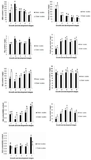 From the beginning of the storage in the lily bulbs, accurately the outer scales (From the outside to the inside of the 3 layers) and the internal scales (scales except the outermost and innermost 3-layer scales) were collected as materials. After weighing and mixing, the materials were frozen by liquid nitrogen for 30 min and placed in a −80 °C refrigerator. The contents of soluble sugars, reducing sugar and sucrose, were carried out by analysis on UV spectrophotometer assays [].