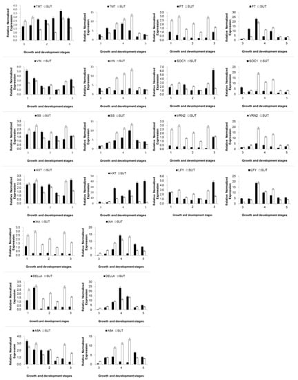 Carbohydrates are not only essential energy for plant growth and development, but also material that regulate specific growth processes with plant hormone signaling networks, such as embryo formation, seed germination, seedling growth, and bulbs formation [,]. In this study, we found that the expression patterns of SUT genes were different from that of hormone genes, but SUT could affect the expression of a hormone gene by affecting the sugar concentration. Studies have shown that exogenous sugars can promote wild Arabidopsis germination while suppressing ABA concentrations []. The effects of different plants were different towards the effects of GA and IAA on flowering. For example, foreign aid GA3 in vitro could make Western azaleas bloom ahead of time []. A high level of GA was beneficial to alfalfa formation, while a high level of IAA was not conducive to alfalfa flower []. The content of IAA in bamboo flowering late was lower than that of bamboo flowering early []. In this study, we found that IAA and DELLA contents were significantly increased and ABA content decreased during the development of lily differentiation. It was speculated that IAA was the promoting factor and ABA and GA3 were negative regulators in lily development. At this time, SUT expressions were consistent with the IAA and DELLA, and opposite to ABA, so SUT may be a flower growth factor.
