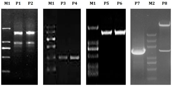 LoSUT clone electrophoresis gel map. M1: marker1: The molecular weights in order from large to small: 2000, 1000, 750, 500, 250, 100 bp; M2: marker2 The molecular weights in order from large to small: 5000, 3000, 2000, 1000, 750, 500, 250, 100 bp; P1, P2: RNA Bands; P3, P4: SUT fragment clone; P5, P6: SUT full length cloning; P7: SUT gene bacteria PCR; P8: BamHI digestion of expression vector pBI121 through XbaI.